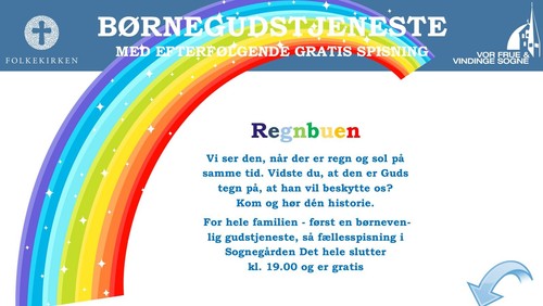 For hele familien - først en børnevenlig gudstjeneste, så fællesspisning i Sognegården Det hele slutter kl. 19.00 og er gratis. Husk tilmelding på vorfrue-vindinge.dk