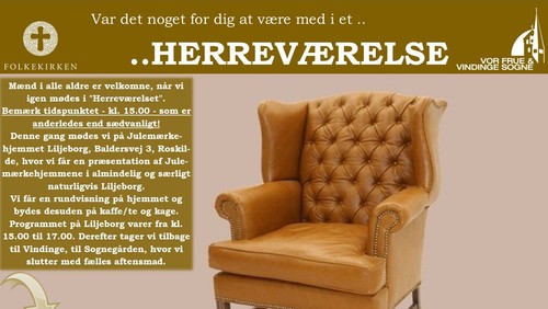 Mænd i alle aldre er velkomne, når vi igen mødes i "Herreværelset". Kender du en, som du tror kunne være interesseret, så inviter endelig vedkommende med!