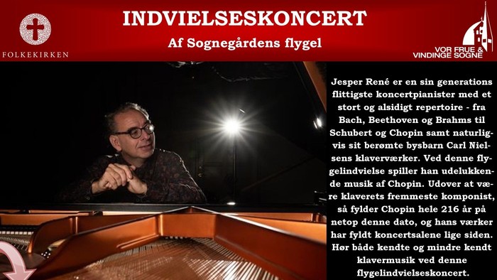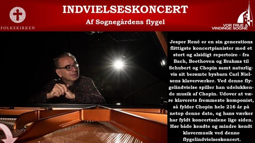 Jesper René er en sin generations flittigste koncertpianister med et stort og alsidigt repertoire - fra Bach, Beethoven og Brahms til Schubert og Chopin samt naturligvis sit berømte bysbarn Carl Nielsens klaverværker. Han er særligt kendt for som den eneste at spille Bachs store cykliske værker, fra Gedser til Grønland og fra Flensborg til Færøerne, men ved denne flygelindvielse spiller han udelukkende musik af Chopin. Udover at være klaverets fremmeste komponist, så fylder Chopin hele 216 år på netop denne dato, og hans værker har fyldt koncertsalene lige siden. Hør både kendte og mindre kendt klavermusik ved denne flygelindvielseskoncert.